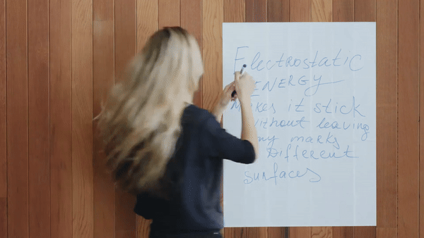The Whiteboard sticks to any smooth surface using electrostatic energy, meaning no glue, no tape, and no drilling. It can be removed and repositioned without leaving marks or damaging walls.